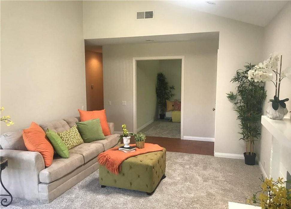 This SINGLE LEVEL END UNIT is located at the end of a cul de sac and features a large wrap around yard and is located next to a large green belt with trees and backs to plenty of green areas! There is a one car garage with roll up door and additional designated parking place right next to the home! The home also offers an additional den/ office or 3rd bedroom with double doors off of the entry! Freshly painted with neutral colors and all new carpeting! The spacious living room features vaulted ceilings and fireplace, and recessed lighting! Kitchen has built in dishwasher, microwave, electric stove and includes fridge. There is an indoor laundry area and washer and dryer are included! Secondary bedroom has mirrored wardrobe doors. Primary bedroom has tall vaulted ceilings and a walk in closet.